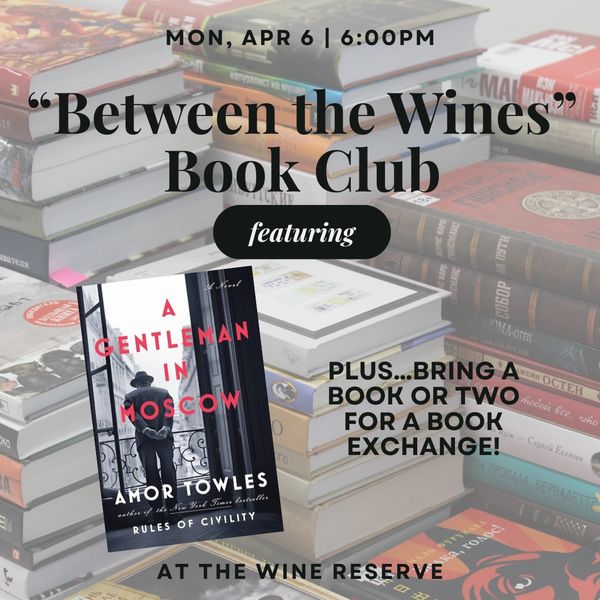 The next “Between the Wines” book club gathering at The Wine Reserve will be on Monday, Apr 6 at 6pm. We will be reading A Gentleman in Moscow by Amor Towles. We are also promoting a book exchange at this event so bring one or two books along with you to trade with others! Happy reading!